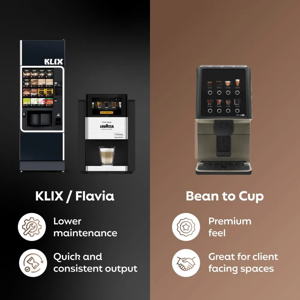 Flavia or Klix Machines – Lower maintenance, quick and consistent output.